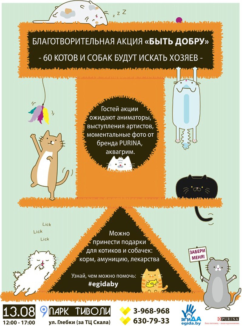 13 августа Общественное объединение защиты животных "Эгида" приглашает минчан и гостей столицы на Благотворительную акцию «Быть добру!». Мероприятие пройдет в парке Тиволи (ул. Глебки, за ТЦ Скала), с 12:00 до 17:00. В ходе благотворительной акции 60 котов и собак будут искать себе новых хозяев. Вы сможете не только обрести нового друга, но и помочь тем животным, у которых пока нет хозяев.