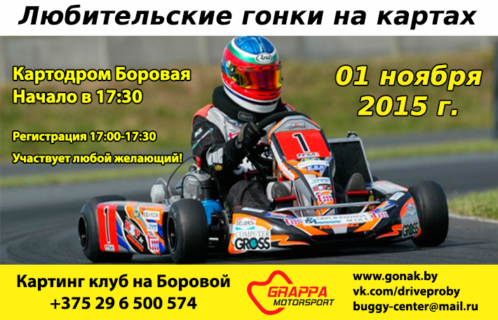 1 ноября в 17:30 в картинг-клубе "ГРАППА-Мотоспорт" (по адресу Минск, Боровая) состоятся соревнования по картингу среди любителей.