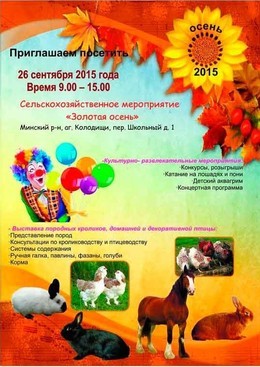 26 сентября пройдет осенняя выставка-ярмарка породистых кроликов, породистой домашней птицы «Золотая осень-2015». Организует выставку Белорусское Общественное Объединение Кролиководов, Дом Культуры аг. Колодищи и Колодищанский Культурно-Спортивный Центр. Торжественное открытие выставки состоится 26 сентября в 9:00 часов по адресу: аг. Колодищи, пер. Школьный, 1.