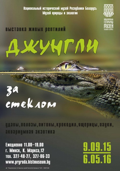 9 сентября 2015 года в Музее природы и экологии открылась выставка «Джунгли за стеклом». Рептилий и паукообразных со всего света можно увидеть в Музее природы и экологии на Карла Маркса, 12. Полозы, удавы, питоны, щитомордники, глазчатые хальциды, пауки из джунглей Азии, Африки и Америки – яркие и экзотичные животные поразят вас своим видом и повадками. Вы можете полюбоваться грацией королевского питона, сфотографировать ящерицу-бананоеда, понаблюдать за скорпионом, посмотреть, как плавает нильский крокодил, как ведут себя более сорока представителей тропической фауны.