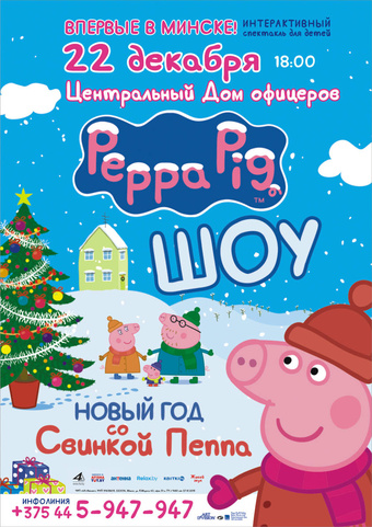 Всех маленьких поклонников мультсериала «Свинка Пеппа» ждет замечательный подарок к Новому году: 22 декабря в Центральном Доме Офицеров состоится веселый новогодний интерактивный спектакль для детей «Новый год со Свинкой Пеппа», созданный по лицензии английской компании "Entertainment ONE UK" - создателя мультфильма "Свинка Пеппа". Начало мероприятий в 15:00 и 18.00.