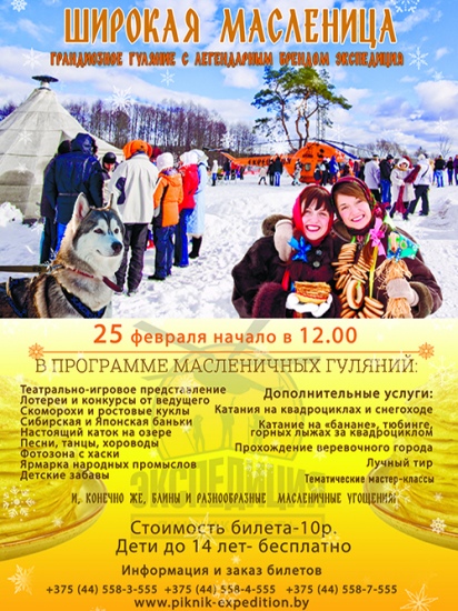 25 февраля 2017 пикник-отель «Экспедиция» приглашает выбраться всей семьей на природу и провести весь день вместе в окружении соснового леса, сияющего чистого снега и свежего воздуха, вместе проводить зиму и встретить весну. Ведь это отличный способ легко и весело познакомить своего ребенка с многовековыми традициями и народными обычаями, хорошенько повеселиться и обзавестись замечательными общими воспоминаниями на многие годы.