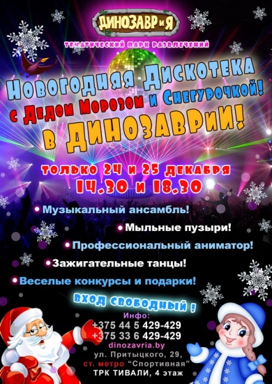 Ваши детки любят танцевать? А мыльные пузыри? Тогда Вас и Ваших карапузов приглашают на зажигательные дискотеки с Дедом Морозом и Снегурочкой в ДИНОЗАВРиЮ.