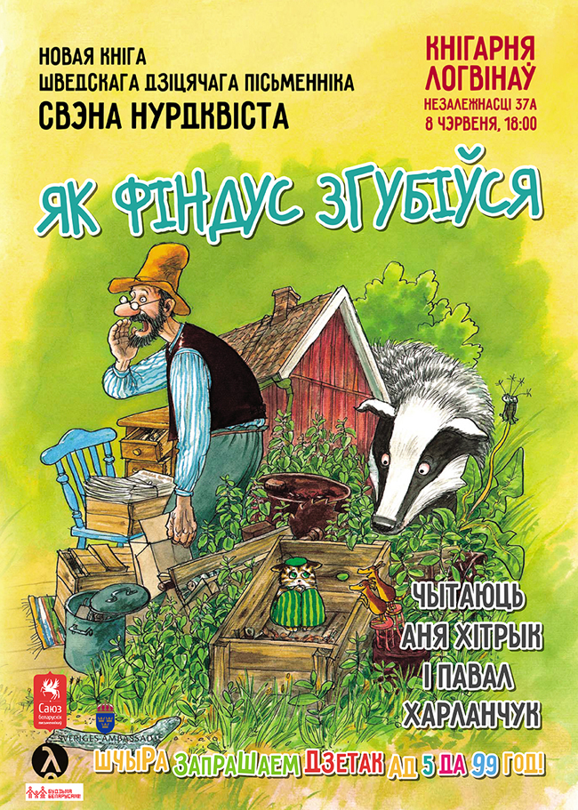 8 чэрвеня ў 18:00 у кнігарне «ЛогвінаЎ» (пр. Незалежнасці, 37а) для дзетак і дарослых адбудзецца прэзентацыя кнігі шведскага пісьменніка і мастака Свэна Нурдквіста «Як Фіндус згубіўся, калі быў маленькі» з удзелам акцёраў Паўла Харланчука і Ганны Хітрык. Уваход вольны!