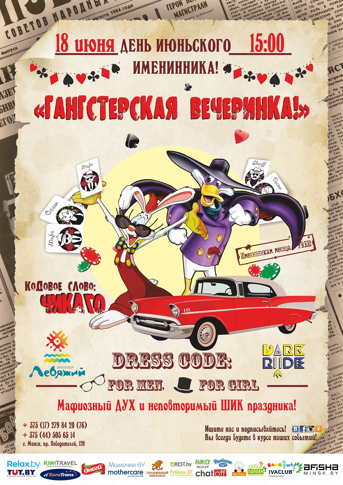 В этот день дети могут посетить не только мероприятие, но и аквазону бесплатно! Проведите уикенд в мафиозной семье и зарядитесь самыми яркими впечатлениями на все лето!