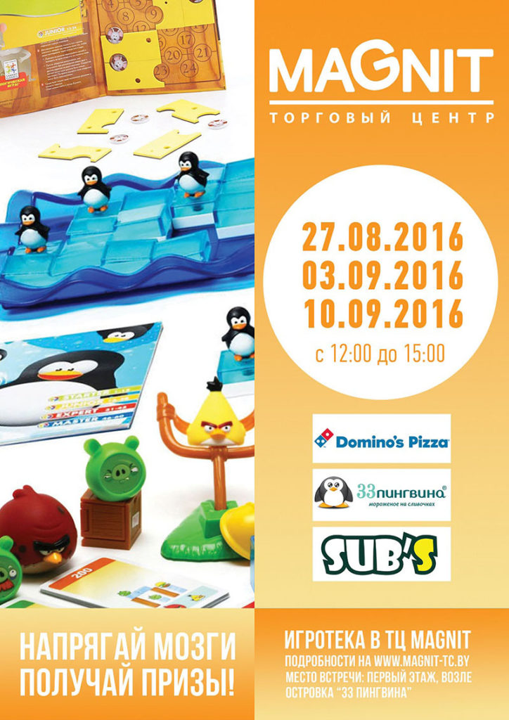Игротека в Магните – это всегда познавательно, весело и вкусно. Организаторы приглашают принять участие в игре всех желающих. Вы можете прийти с друзьями или с семьёй сложить головоломку и получить призы от самых аппетитных партнеров Domino's, SUB'S и 33 пингвина.
