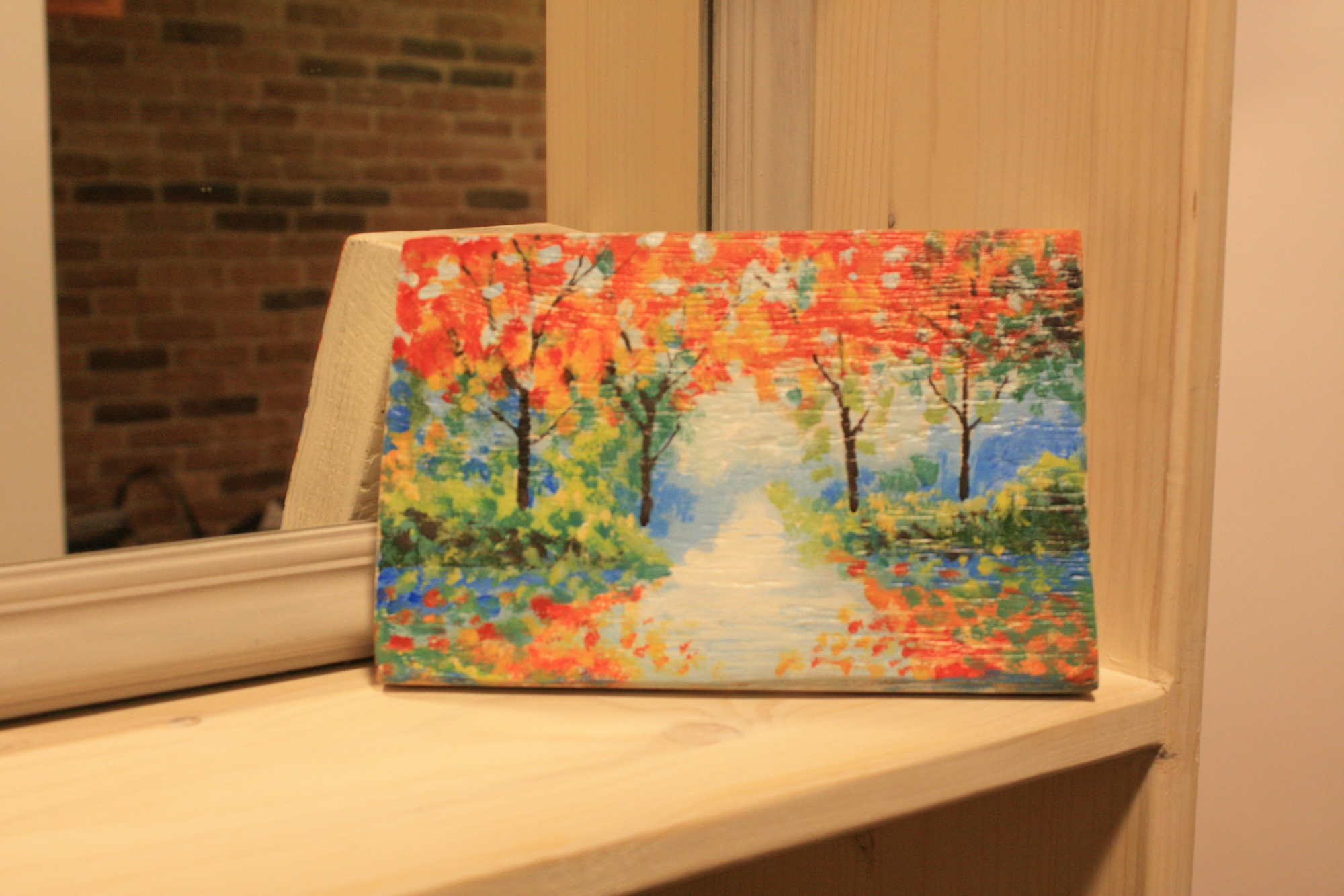 пейзаж акрылавымi фарбамi на падрыхтованай дошцы.