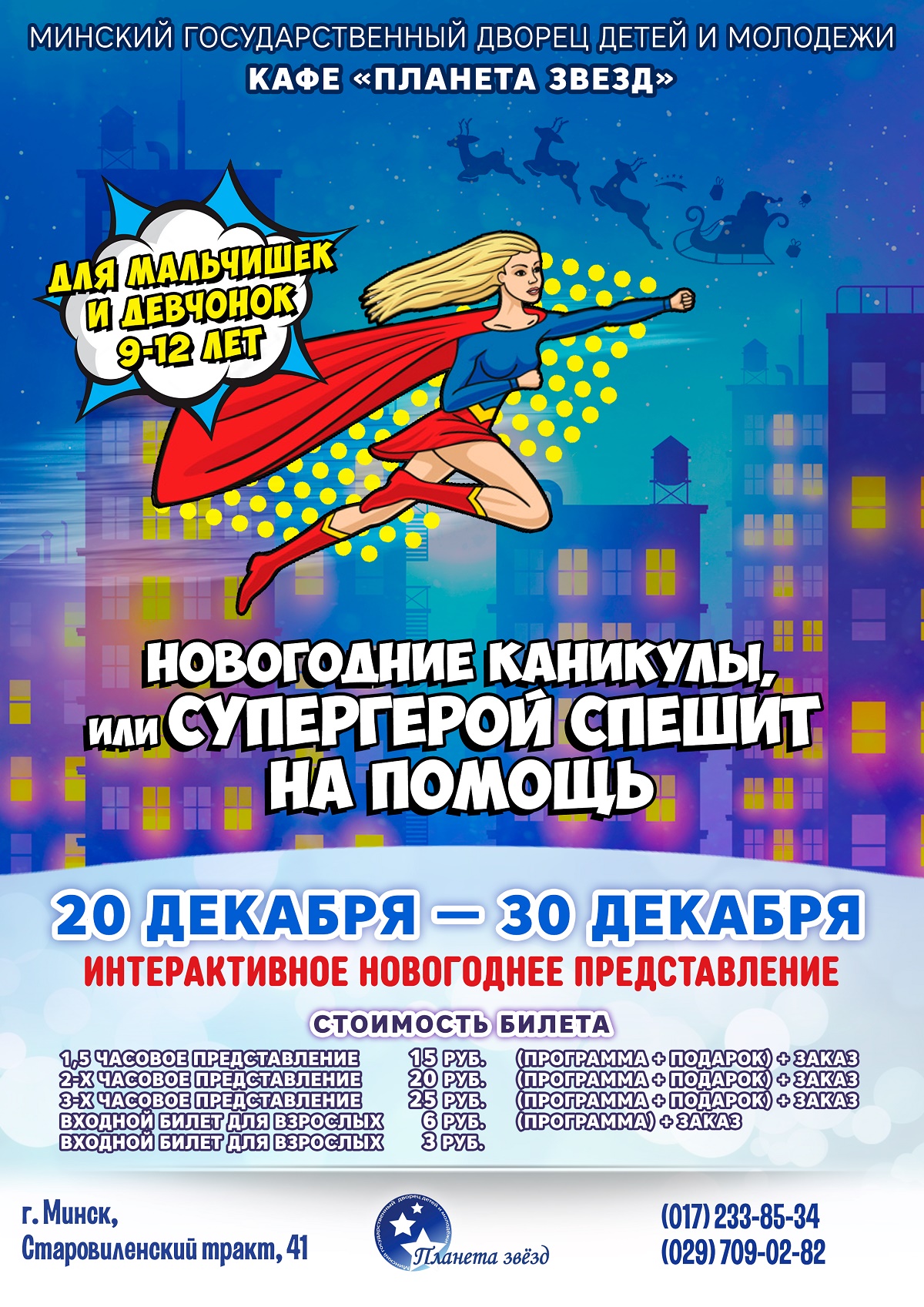 Самое детское кафе «Планета звезд» Дворца детей и молодежи приглашает девчонок и мальчишек, а также их родителей принять участие в интерактивных театрализованных шоу-программах 20 декабря – 30 декабря «Новогодние каникулы, или супергерой спешит на помощь» (для девчонок и мальчишек 9 12 лет).