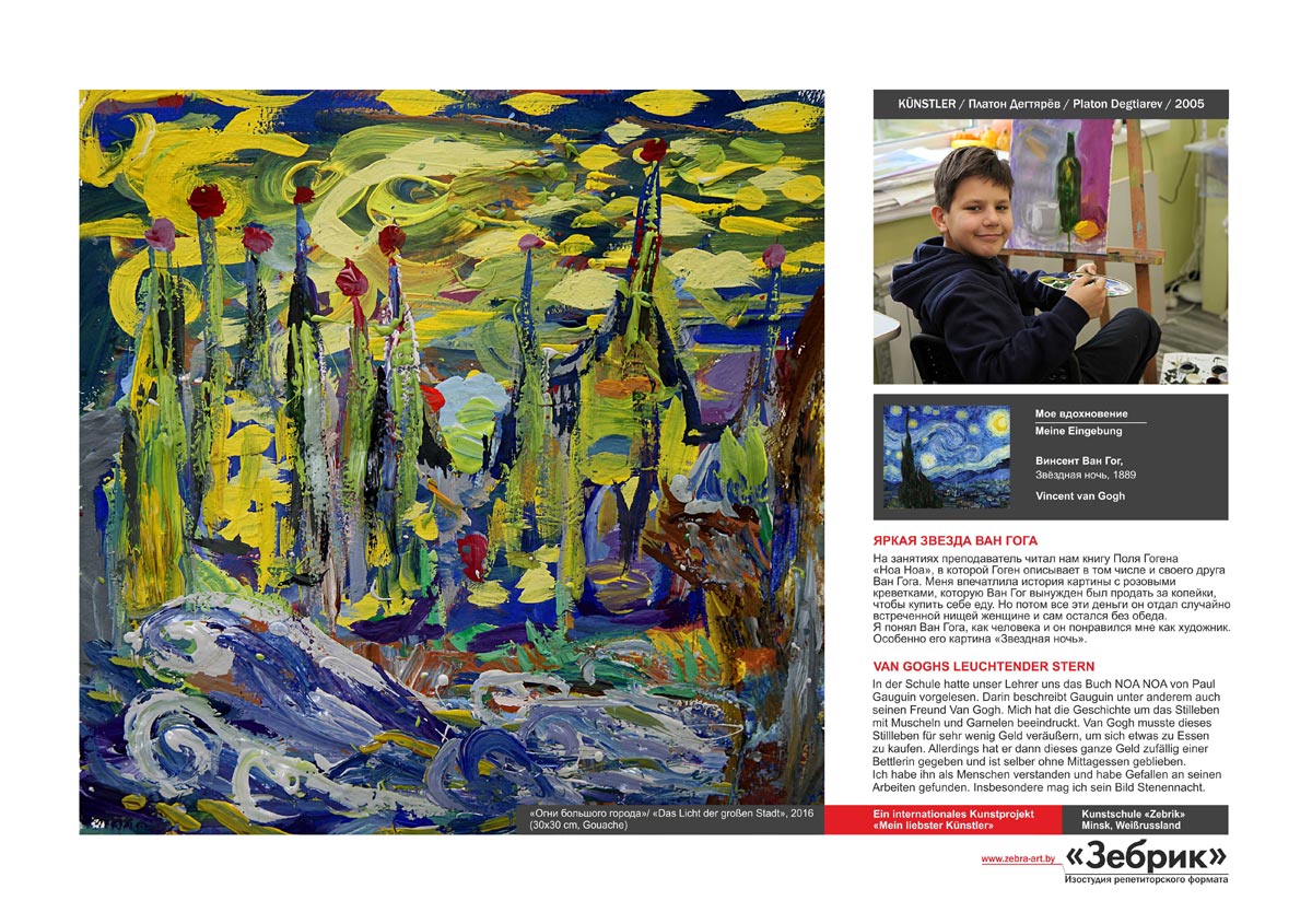 Впервые выставочная площадка такого высокого уровня, как Национальный центр современных искусств, разместила в своих стенах экспозицию юных художников. Причиной тому – необычный арт-проект «Мой любимый художник», собравший работы детей и подростков из двух стран – Беларуси и Германии. Арт-проект носит культурно-образовательный характер и предполагает два выставочных этапа.