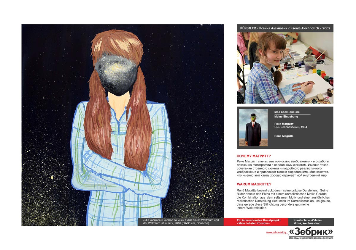 Например, талантливая Ксения Алехнович в свои 14 лет считает свою жизнь настолько же сюрреалистичной, как на полотнах мастера сюрреализма Рене Магритта. Она нарисовала себя на фоне космического пространства в своей любимой рубашке в клетку, а вместо лица изобразила космос с россыпью звезд. Работа Ксении называется «Я в космосе и космос во мне».