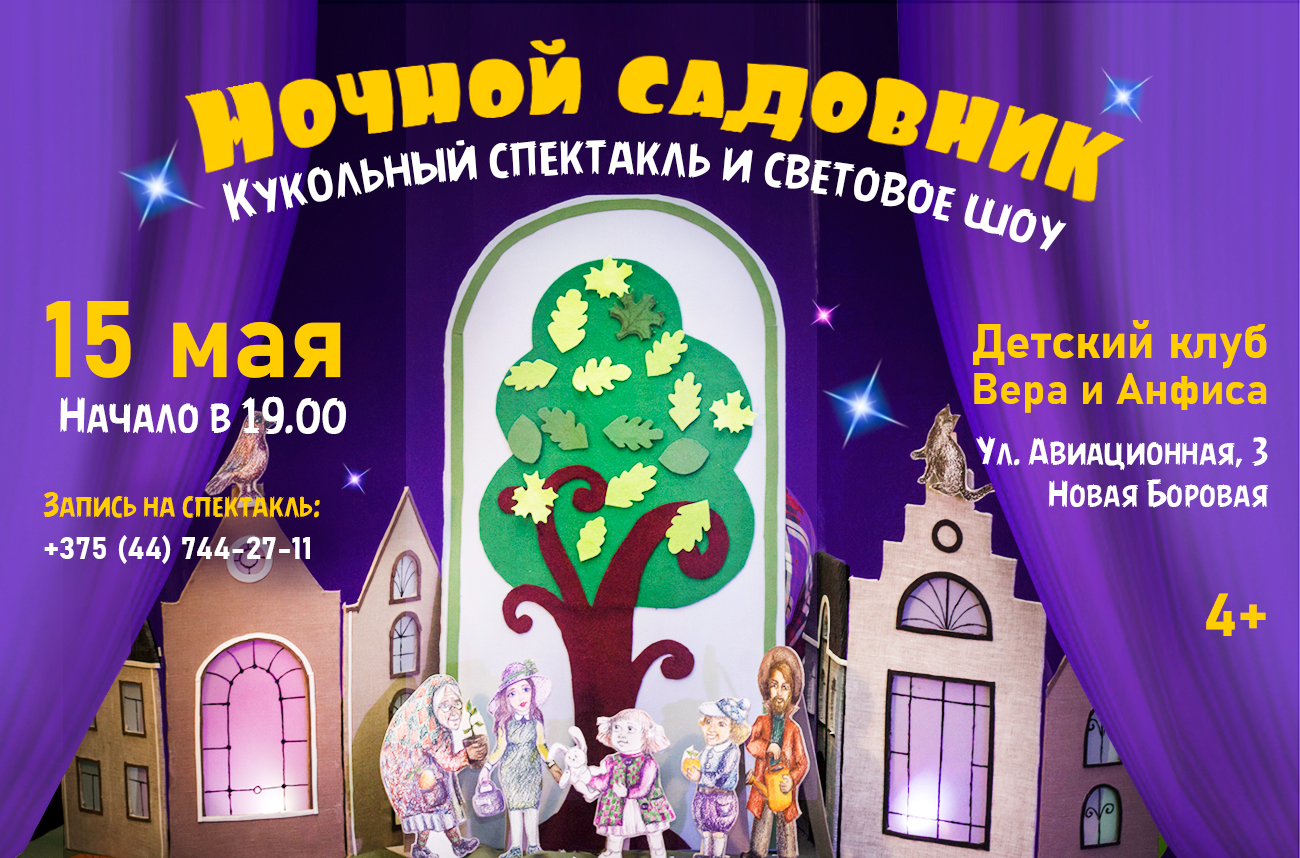 «Ночной садовник» — кукольный спектакль с рисованием светом и театром теней для детей от 4 лет. В спектакле звучит авторская музыка (арфа, панфлейта). Эта сказка о волшебстве, которое может изменить всё и всех…