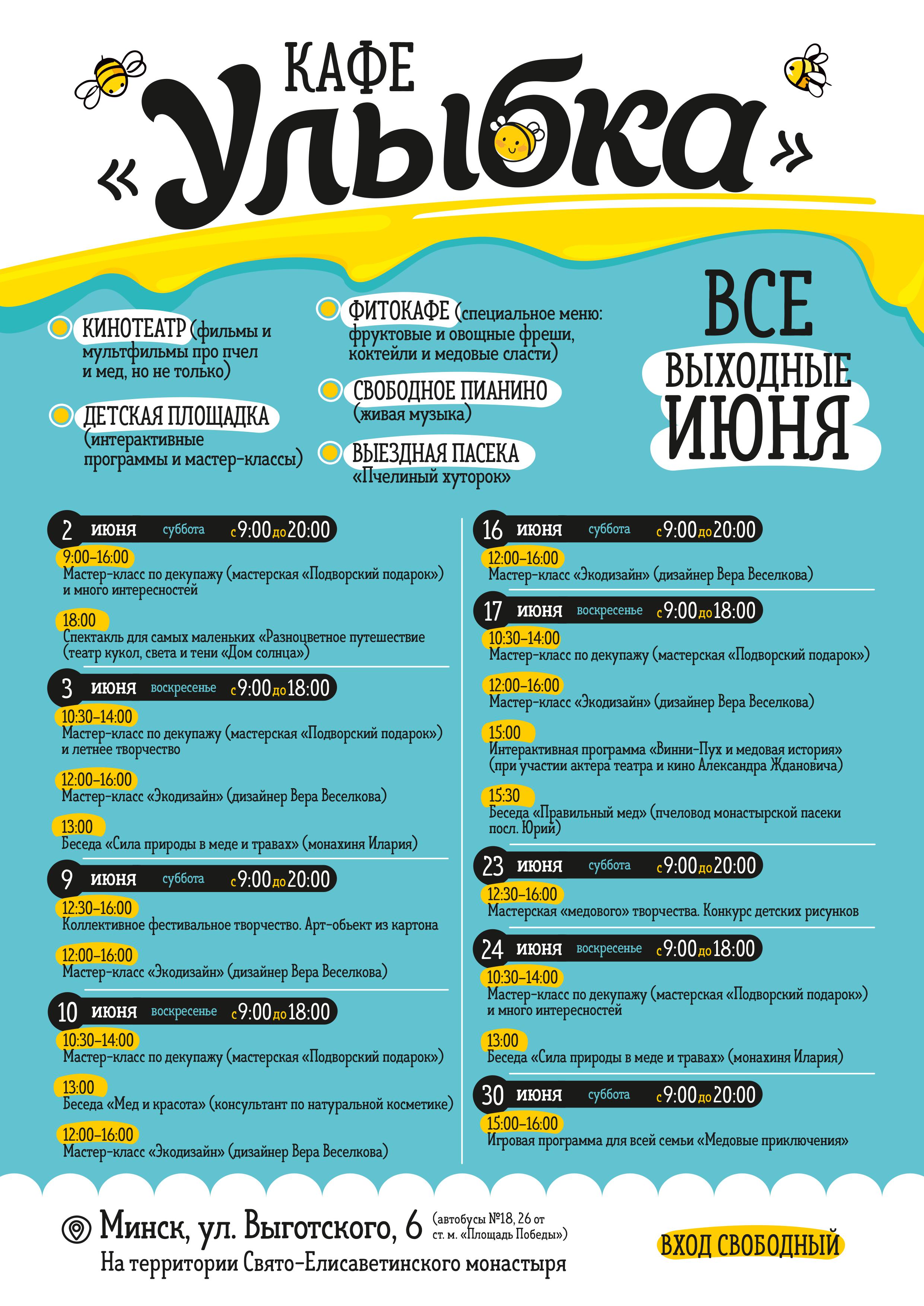 Самый вкусный фестиваль для всей семьи «Медовые дни» будет проходить каждые выходные июня в минском Свято-Елисаветинском монастыре. О целебных свойствах меда знает каждый, поэтому организаторы проводят фестиваль под девизом «Ешьте здоровье ложками!» и обещают, что меда хватит на всех.
