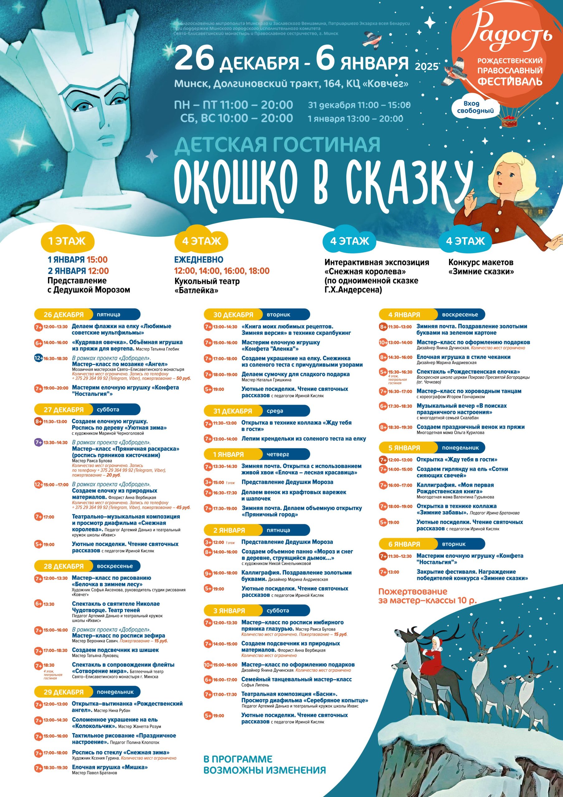 В программе для детей вас ожидает интерактивная экспозиция по сказке «Снежная Королева», тематические мастер-классы, добрые спектакли театра «Батлейка», конкурс зимних объемных макетов. Программа для взрослых будет насыщена душеполезными встречами, музыкальными концертами, спектаклями и представлениями. Специальные гости фестиваля проведут рождественские диалоги. На выставке-ярмарке уникальные изделия ручной работы представят монастыри, храмы и ремесленники из разных стран: Беларуси, России, Сербии, Сирии, Палестины, Греции.