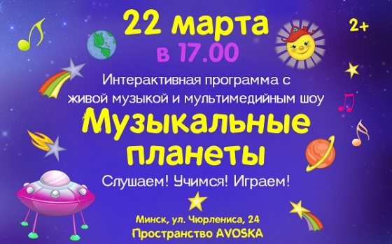 Музыкальные планеты — интерактивная, театрализованная программа с живой музыкой (арфа, панфлейта, скрипка, ударные, шумовые инструменты), развивающими играми и мультимедийным шоу. На чудесном звездолете мы отправимся в путешествие по музыкальным планетам. Вместе с жителями этих планет мы будем слушать музыку, играть и учиться. Интересно, кого мы встретим в нашем путешествии?