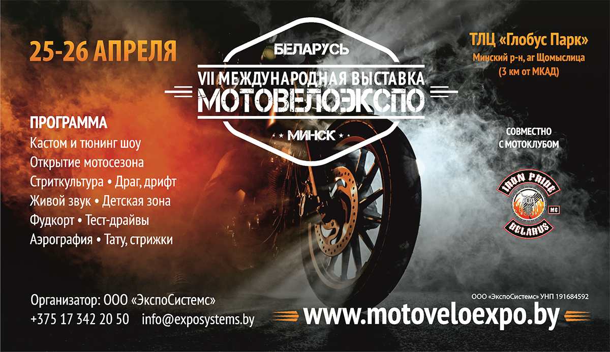 «Мотовелоэкспо» - это выставка с различными интерактивными площадками, где представлены товары и услуги мото- и велоиндустрии, активного отдыха и спорта. Это площадка, которая предоставит дополнительные возможности для обмена опытом, презентаций компаний, поиска новых клиентов и выстраивания деловых отношений. Мероприятие станет плацдармом для республиканского открытия мотосезона от Iron Pride MC Belarus с традиционной многотысячной колонной мотоциклистов.