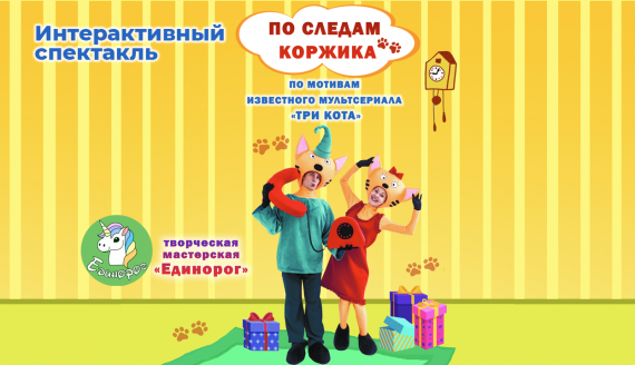 Творческая мастерская «Единорог» приглашает свой спектакль для малышей «По следам коржика». Спектакль создан по мотивам известного мультсериала «Три кота».