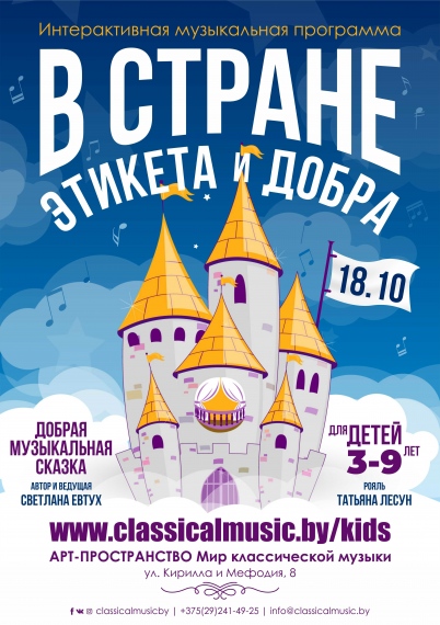 В программе – знакомство детей с этикетом, а также музыкой классических и современных композиторов – известными произведениями Баха, Моцарта, Шопена, Чайковского, перемежающиеся добрыми детскими песнями.