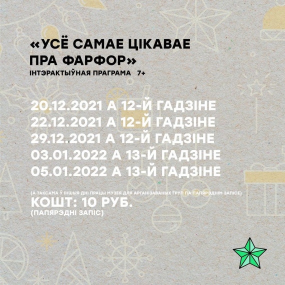 Участников программы также ожидает захватывающая игра «Загадки хранителя коллекции фарфора», после которой они направятся в музейную «мастерскую». На память о путешествии по Стране фарфора каждый получит особенный подарок, сделанный своими руками!