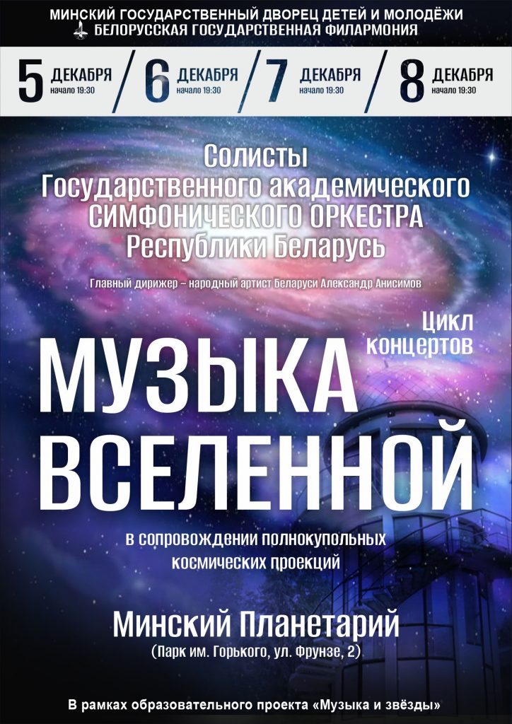 5, 6, 7 и 8 декабря состоится цикл концертов солистов Государственного академического симфонического оркестра Республики Беларусь в минском Планетарии. Мероприятия проводятся в рамках образовательного проекта «Музыка и звёзды».