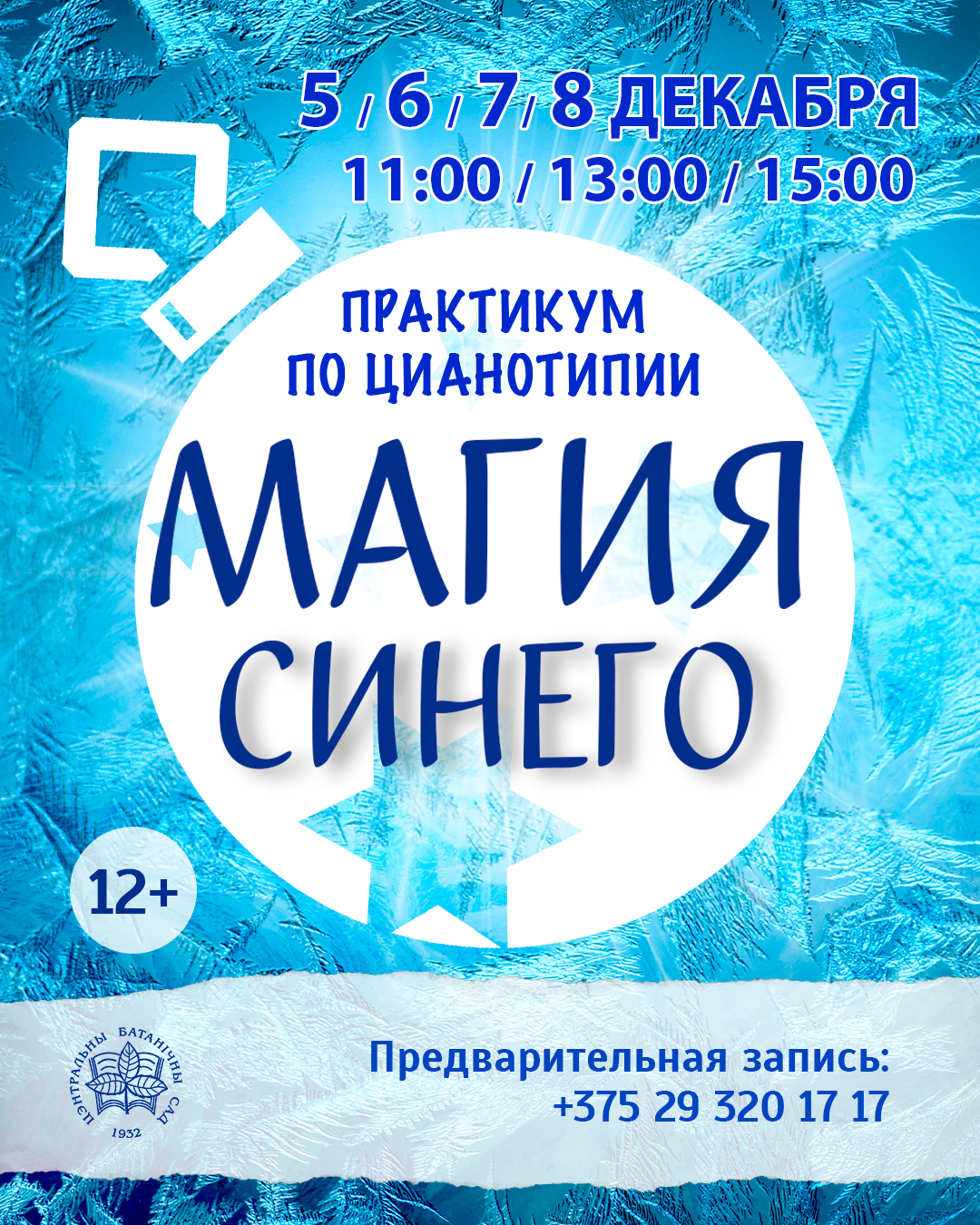 5, 6, 7 и 8 декабря 2024 г. Центральный ботанический сад НАН Беларуси приглашает на практикум по цианотипии «Магия синего»! С помощью техники цианотипии каждый сможет освоить уроки волшебства и погрузиться в атмосферу светомагии!