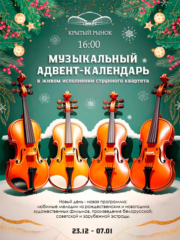 Ежедневно с 23 по 31 декабря 2023 и со 2 по 7 января 2024 года (1 января — выходной) под куполом крытого рынка будут звучать волшебные новогодние и рождественские композиции. Откроет программу легендарная «Ирония судьбы». Все музыкальные ленты этого фильма озвучит струнный оркестр.