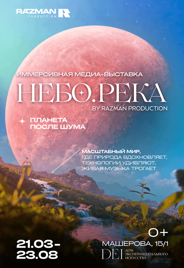 Приходите за вдохновением на иммерсивную медиа-выставку «НЕБО.РЕКА» с 18 марта по 23 августа в Дом Экспериментального Искусства DEI (Минск, пр. Машерова, 15/1, вход со двора).