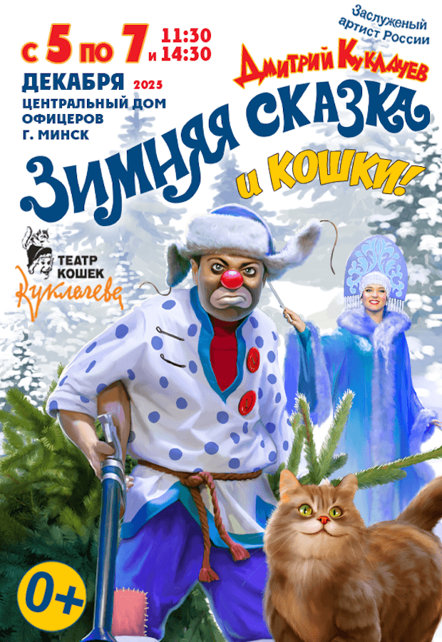 Заслуженный артист России Дмитрий Куклачёв и его непревзойдённые 40 кошек приглашают Вас и Ваших детей в путешествие по сказочному лесу! Всех зрителей ждёт сюрприз: они все без исключения станут непосредственными участниками спектакля и окажутся под волшебным снежным покрывалом Зимушки-Зимы.