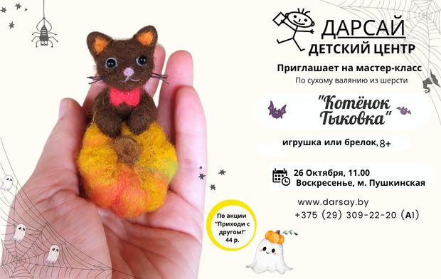В воскресенье 26 октября приглашают мальчишек и девчонок от 8 лет свалять Котёнка с игривым характером. Он с нетерпением ждёт Хэллоуин. Только в эту ночь его любимая игрушка тыковка светится загадочным оранжевым цветом.