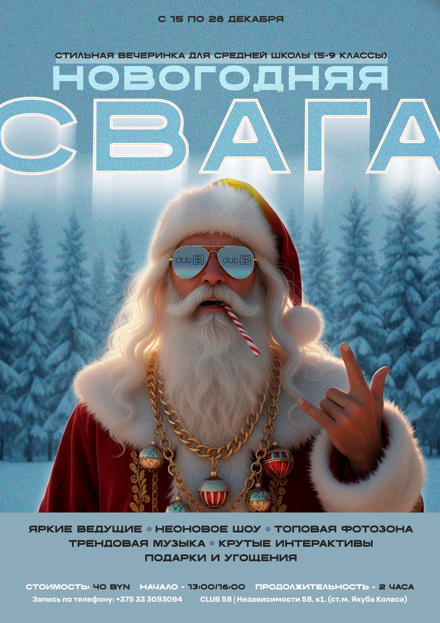 Стильные ведущие устроят сногсшибательную вечеринку в честь Нового 2026 года. Свага – это значит крутой! И для крутых ребят: только популярная музыка и тренды, мультимедийные игры и челленджи, новогоднее лазерное и неоновое шоу.