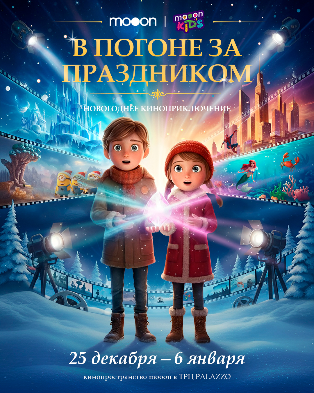 Впервые в mooon уникальное новогоднее киноприключение — интерактивный спектакль «В погоне за праздником!». Это не просто представление, а настоящая сказка-конструктор с живыми актёрами на сцене, где каждый зритель становится главным героем и решает судьбу праздника вместе с любимыми киногероями.