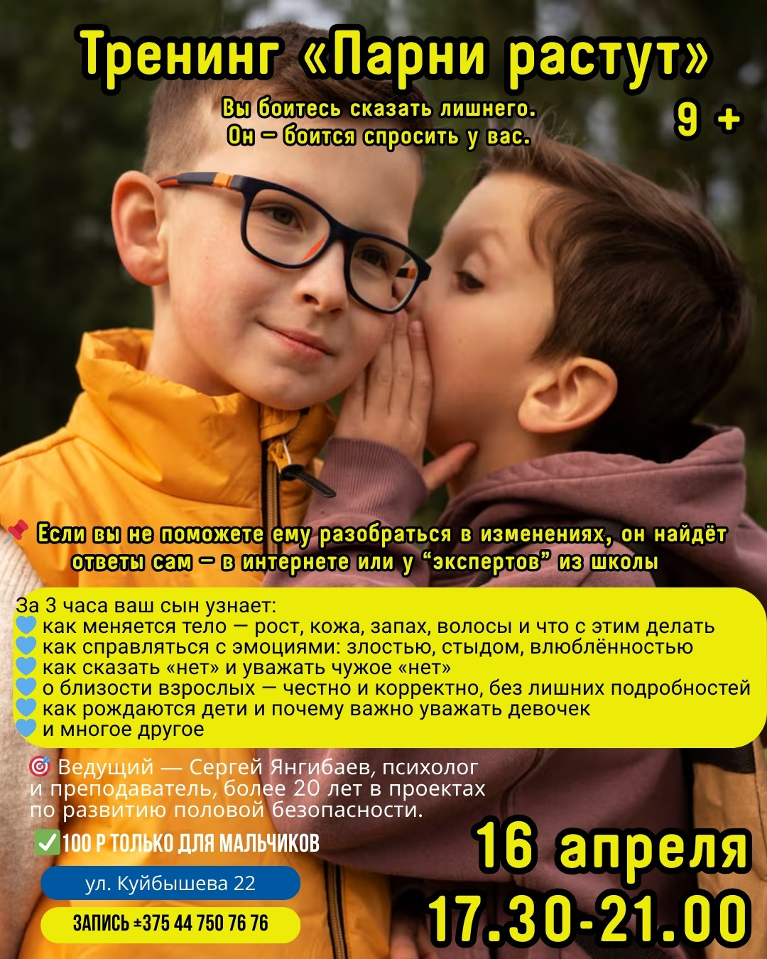 В дружелюбной и безопасной атмосфере мальчики смогут задать вопросы и получить понятные ответы.Формат: только для мальчиков, без родителей — так проще и комфортнее.
