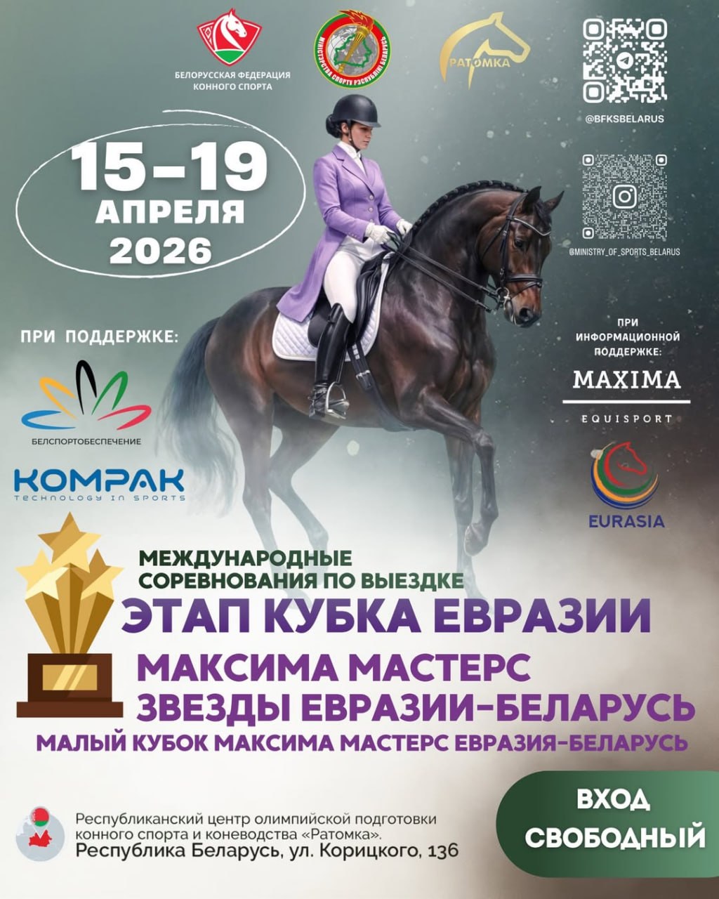 С 15 по 19 апреля 2026 года на базе учреждения «Республиканский центр олимпийской подготовки конного спорта и коневодства» Ратомка примет Международные соревнования «Этап Максима Мастерс Звезды Евразии» и «Этап Малого Кубка Евразии», а также международные соревнования по выездке среди юниоров и юношей.