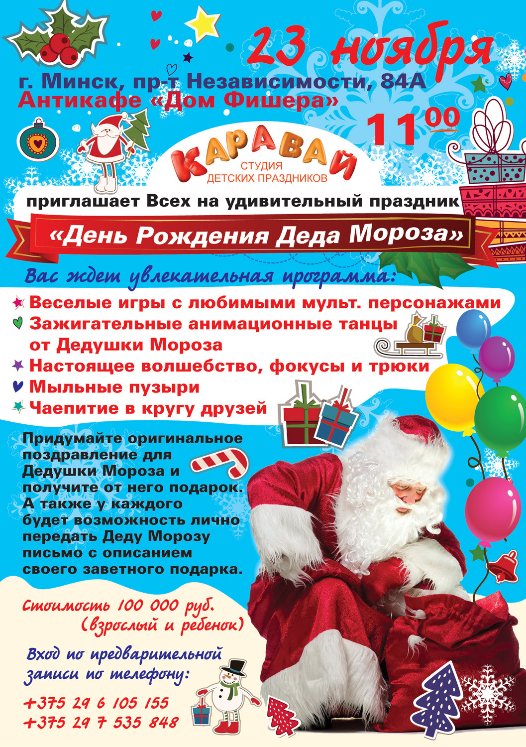 Друзья, знаете ли вы что у Дедушки Мороза скоро День Рождения? Студия детских праздников "Каравай" подготовила дедушке сюрприз - друзья соберутся, чтобы спеть ему Каравай, от души повеселиться и, конечно, задуть именинные свечи.