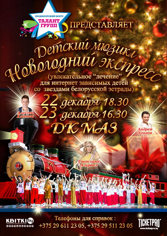 22 декабря в 18.00 и 23 декабря в 16:30 из уютного и гостеприимного зала ДК «МАЗ» в необычное путешествие отправляется сказочное изобретение - «Новогодний экспресс», попав в который вы побываете в 11-ти странах мира и увидите…… Приходите и все увидите!!!