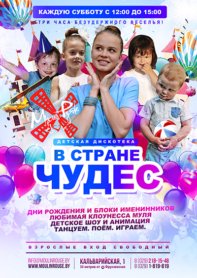 Каждую субботу с 12.00 до 15.00 – праздник для детей и их родителей – три часа удовольствия и безудержного веселья. Дискотека рассчитана для детей до 12 лет.