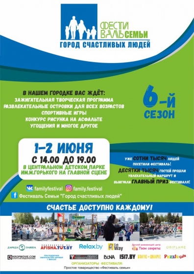 1-2 июня с 14:00 до 19:00 в парке им.М.Горького вас ждёт более 30 развлекательных островков для всех возрастов. Всей семьей вы сможете сделать хенд-мейд подарки для близких, сфотографироваться на фотозоне, выиграть в конкурсе рисунка на асфальте. А для спортивных семей поиграть во флорбол, воздушный футбол, боулинг, хоккей и походить по стропе станет отличным шансом укрепить семейный дух. Особые развлечения приготовлены на островках «Мыльные пузыри», «Ну, погоди!», «Хулахупы». Чай, попкорн и другие бесплатные угощения ждут всех гостей Фестиваля.