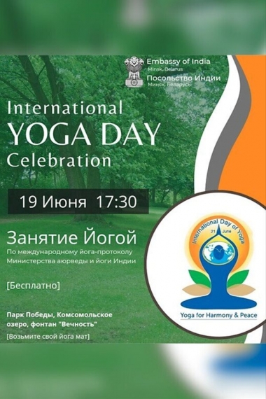 В честь Международного дня Йоги Посольство Индии в Республике Беларусь организует 19 июня 2025 года в 17:30 в Парке Победы (Комсомольское озеро), рядом с фонтаном «Вечность».
