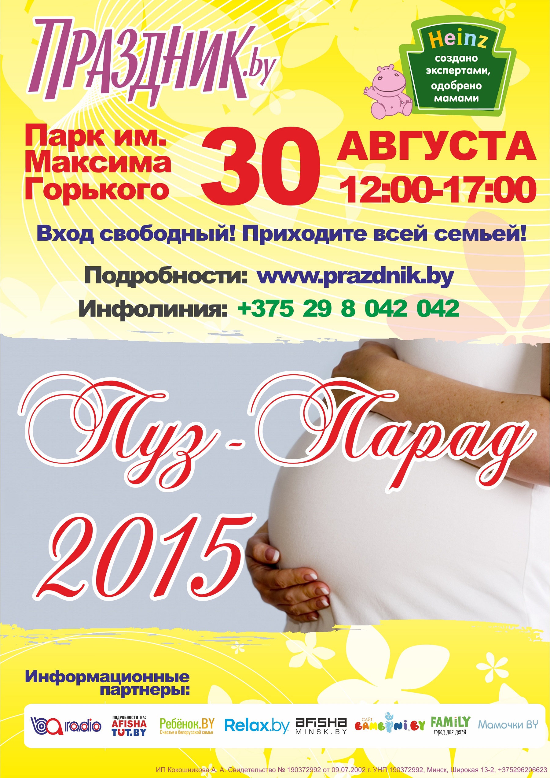 Участников «Пуз-парада» ждет насыщенная праздничная программа, выступления звезд эстрады, множество сюрпризов, подарков и развлечений! Например, на площадке генерального партнера проекта компании Heinz у вас будет возможность получить профессиональную консультацию педиатров по прикорму и питанию детей, попробовать продукцию и принять участие в уникальной фотосессии.