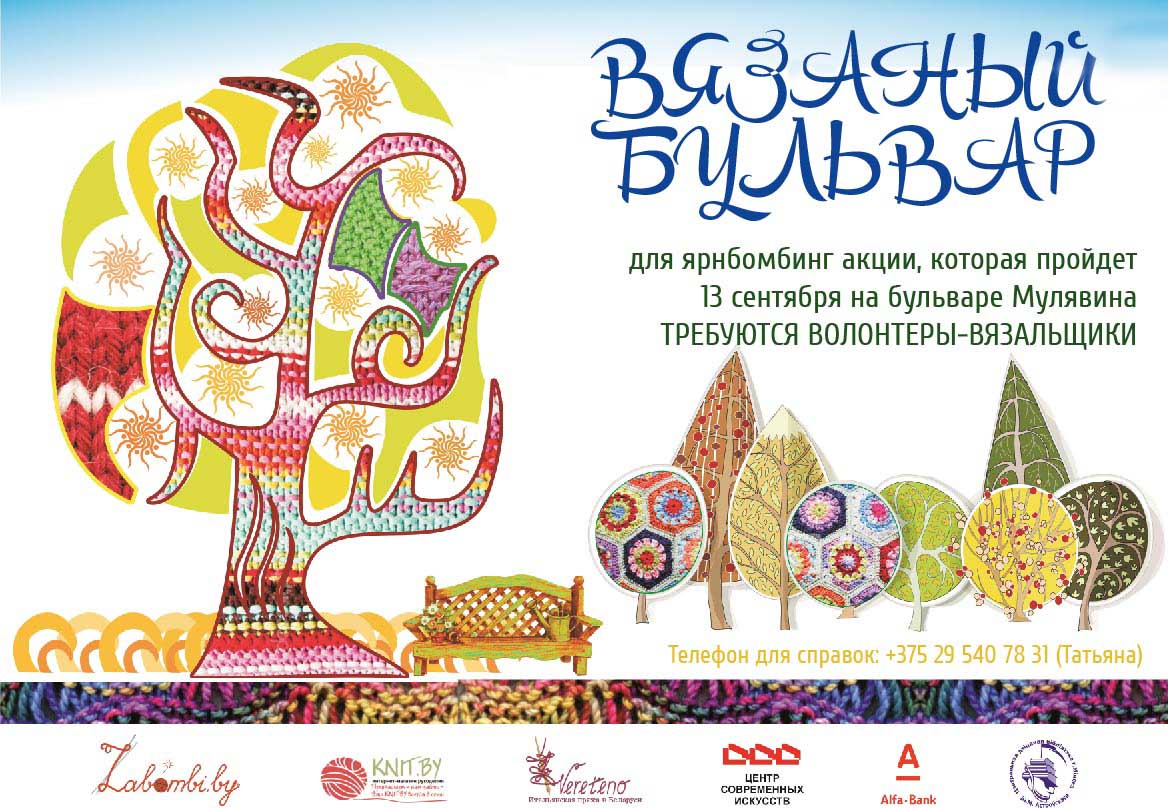 Центр Современных Искусств совместно с творческим клубом Zabombi.by готовит яркую акцию к Дню города. Акция «Вязаный Бульвар» пройдет 13 сентября в сквере на бульваре Мулявина.