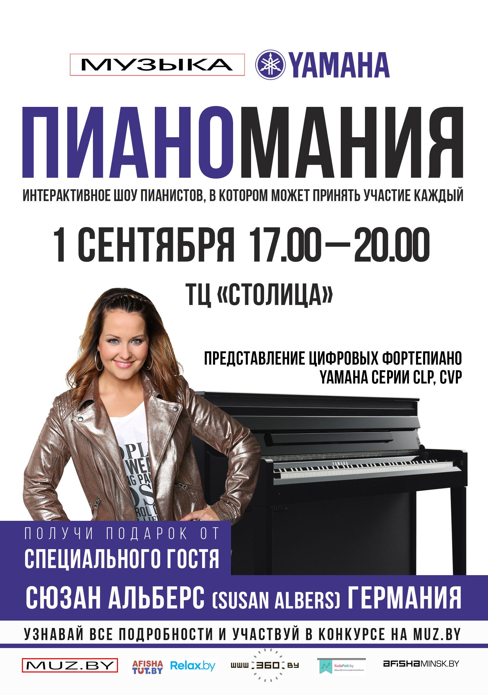 1 сентября в Минске впервые пройдет интерактивное шоу пианистов под названием Пианомания, в котором сможет принять участие каждый желающий. В рамках мероприятия в ТЦ «СТОЛИЦА» выступит с мастер-классом известная немецкая пианистка и вокалистка Сюзан Альберс, а зрителей ждут сюрпризы и подарки от компании YAMAHA и магазина «Музыка».