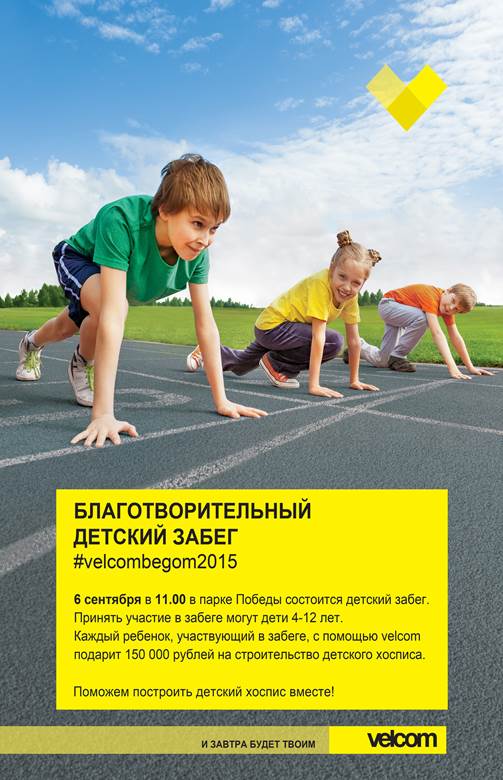 Для помощи хоспису, 6 сентября в Парке Победы, на набережной Свислочи, velcom при поддержке Белорусской федерации легкой атлетики организует детский благотворительный забег.