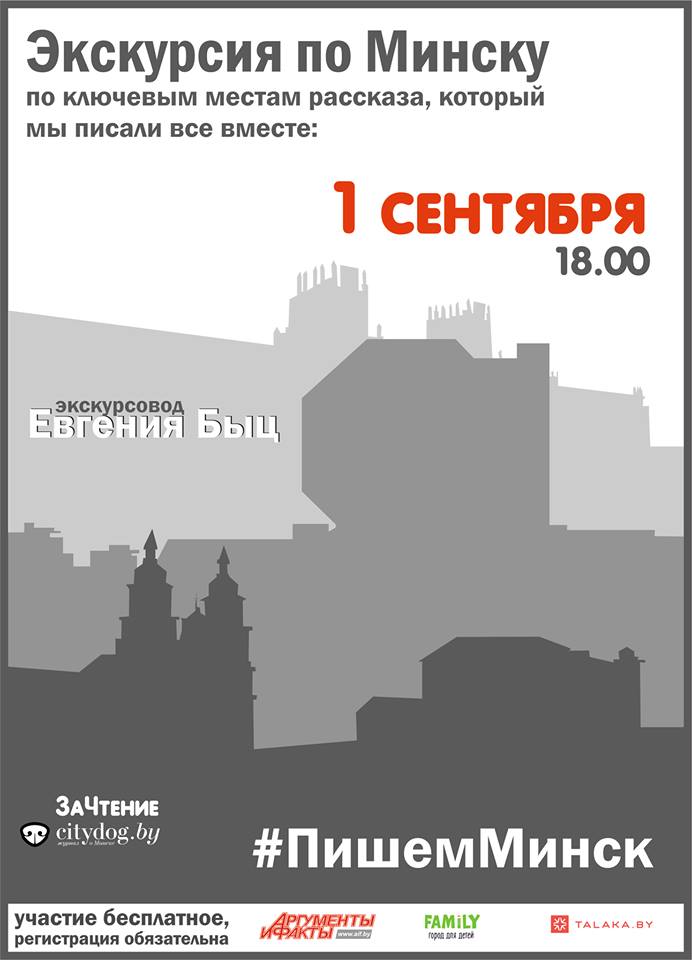 Четыре недели организаторы писали рассказ про город в рамках совместного проекта ЗаЧтения и Citydog.by #ПишемМинск. И вот, как обещали, 1 сентября в 18.00 участники соберутся на финальную встречу в виде экскурсии. Проведет ее замечательный и смелый экскурсовод Евгения Быц. На встречу приглашаются подростки от 16 лет.