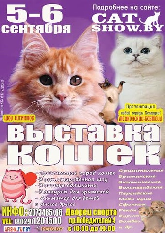 Осень начинается с пушистого мира кошачьих 5 и 6 сентября во Дворце спорта! Грациозные и изящные, ласковые и смешные, игривые и любопытные кошки будут радовать посетителей осенней выставки-шоу на протяжении двух дней. Милые питомцы проявят свои таланты в различных конкурсах, а их хозяева покажут свое мастерство.
