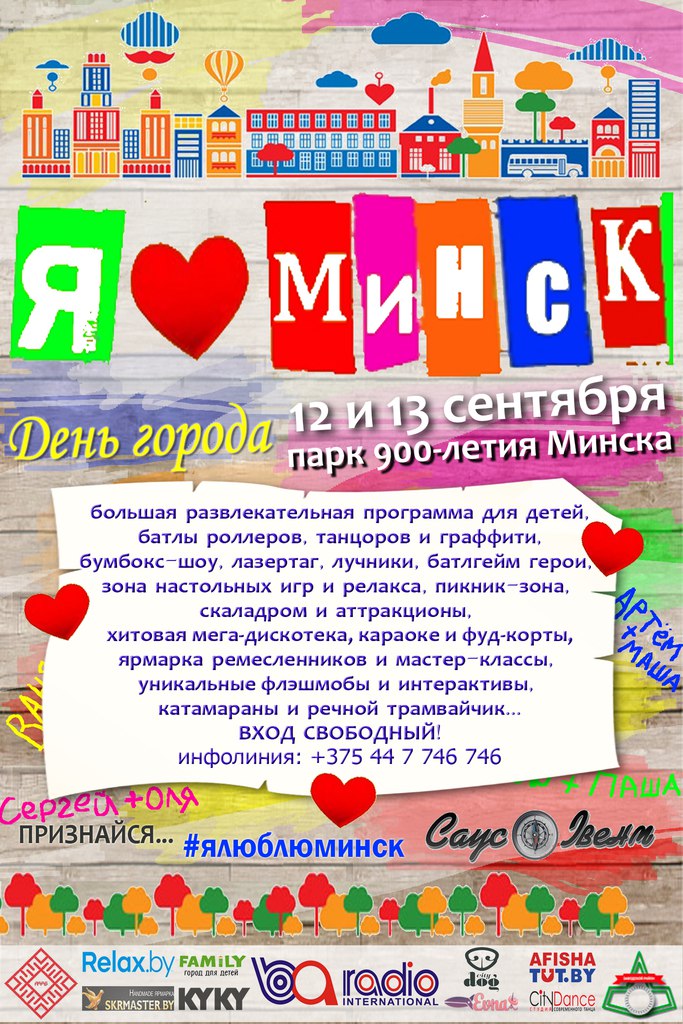 12 и 13 сентября (с 10 утра) в самом красивом и современном парке им. 900-летия г. Минска (возле «Чижовка-арены») состоится большой и яркий праздник «Я ЛЮБЛЮ МИНСК». Гостей ждут: большая развлекательная программа для детей, батлы роллеров, танцоров и граффити, бумбокс-шоу, лазертаг, лучники, батлгейм герои, зона настольных игр и релакса, пикник-зона, скаладром и аттракционы и многое другое.