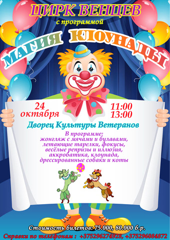 Детей и взрослых в конце октября ждет насыщенная программа «Магия клоунады», где смешные клоуны веселят зрителя остроумными диалогами, играми, иллюзионными аттракционами, жонгляжем, эквилибром. В представлении также участвуют пушистые «артисты» - дрессированные кошки и собачки.