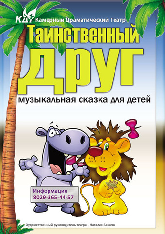 Камерный Драматический Театр приглашает вас к себе в гости на музыкальную сказку «Таинственный друг». Музыкальная сказка про то, как однажды в одно прекрасное утро красивый и ловкий Львенок понял, что у него нет "настоящего друга".