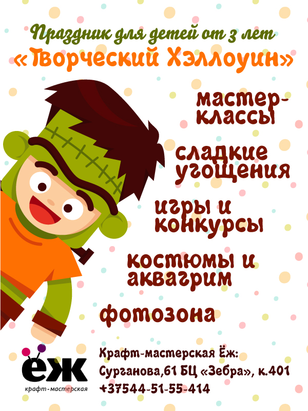 Праздник «Творческий Хэллоуин» как страшила Франкенштейн сшит из нескольких частей: творческая, сладкая, развлекательная, магическая, незабываемая. Ни один гость не сможет забыть этот праздник. В мастерской будет работать тематическая фотозона с тыквами, привидениями, летучими мышками и другими секретными ингредиентами.
