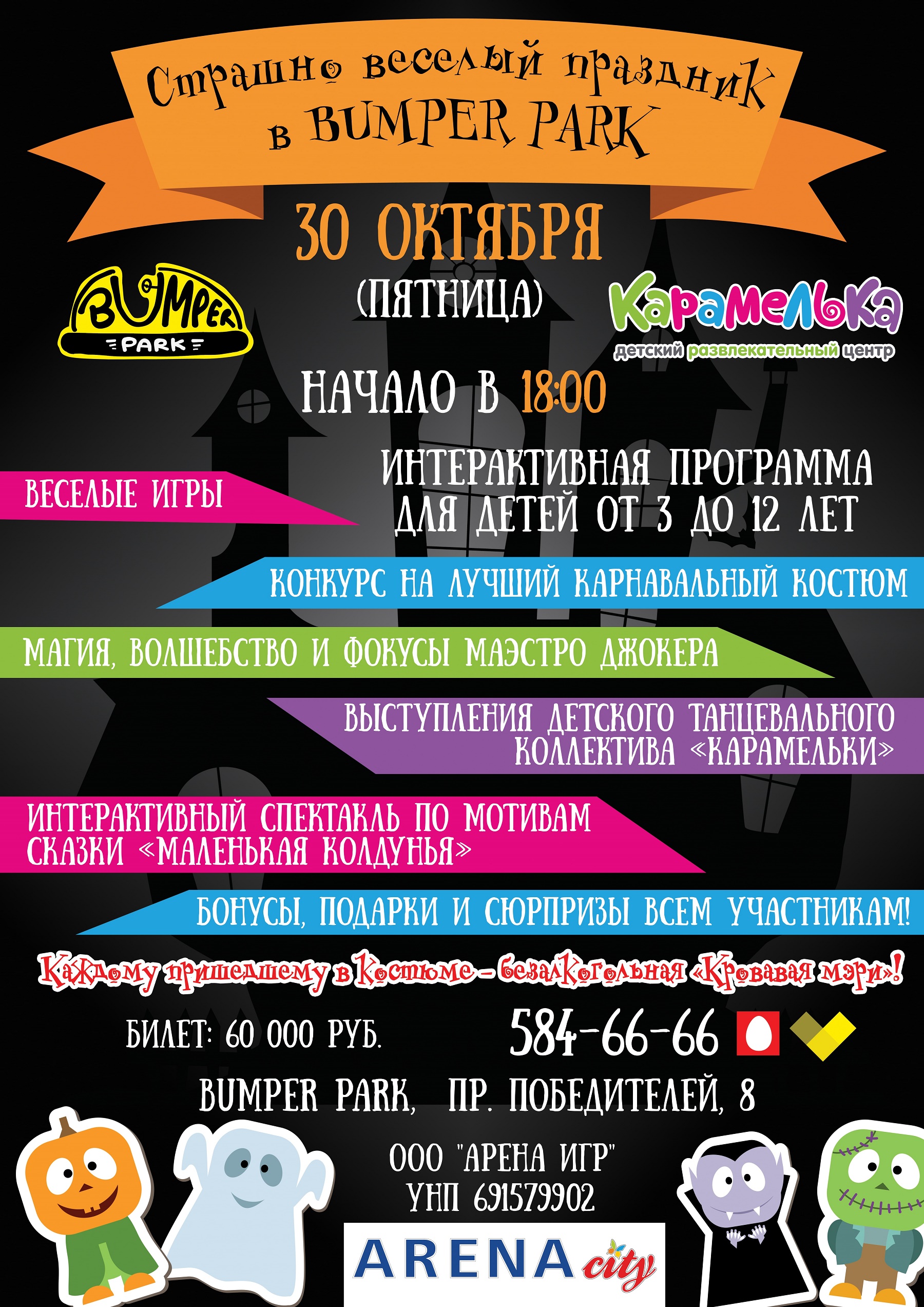 Развлекательный центр BUMPER PARK приглашает на страшно веселый праздник детей от 3 до 12 лет. В программе: веселые игры, конкурс на лучший карнавальный костюм, магия, волшебство и фокусы Маэстро Джокера, выступления детского танцевального коллектива «Карамельки», интерактивный спектакль по мотивам сказки «Маленькая колдунья» и подарки всем участникам.