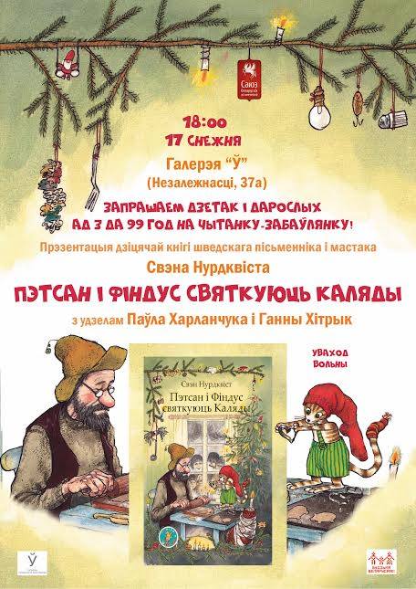 17 снежня ў 18:00 Галерэя сучаснага мастацтва "Ў" запрашае дзетак і дарослых на прэзентацыю кнігі шведскага пісьменніка і мастака Свэна Нурдквіста "Пэтсан і Фіндус святкуюць Каляды" з удзелам акцёраў Паўла Харланчука і Ганны Хітрык. Пераклад на беларускую мову зрабiла Надзея Кандрусевіч.