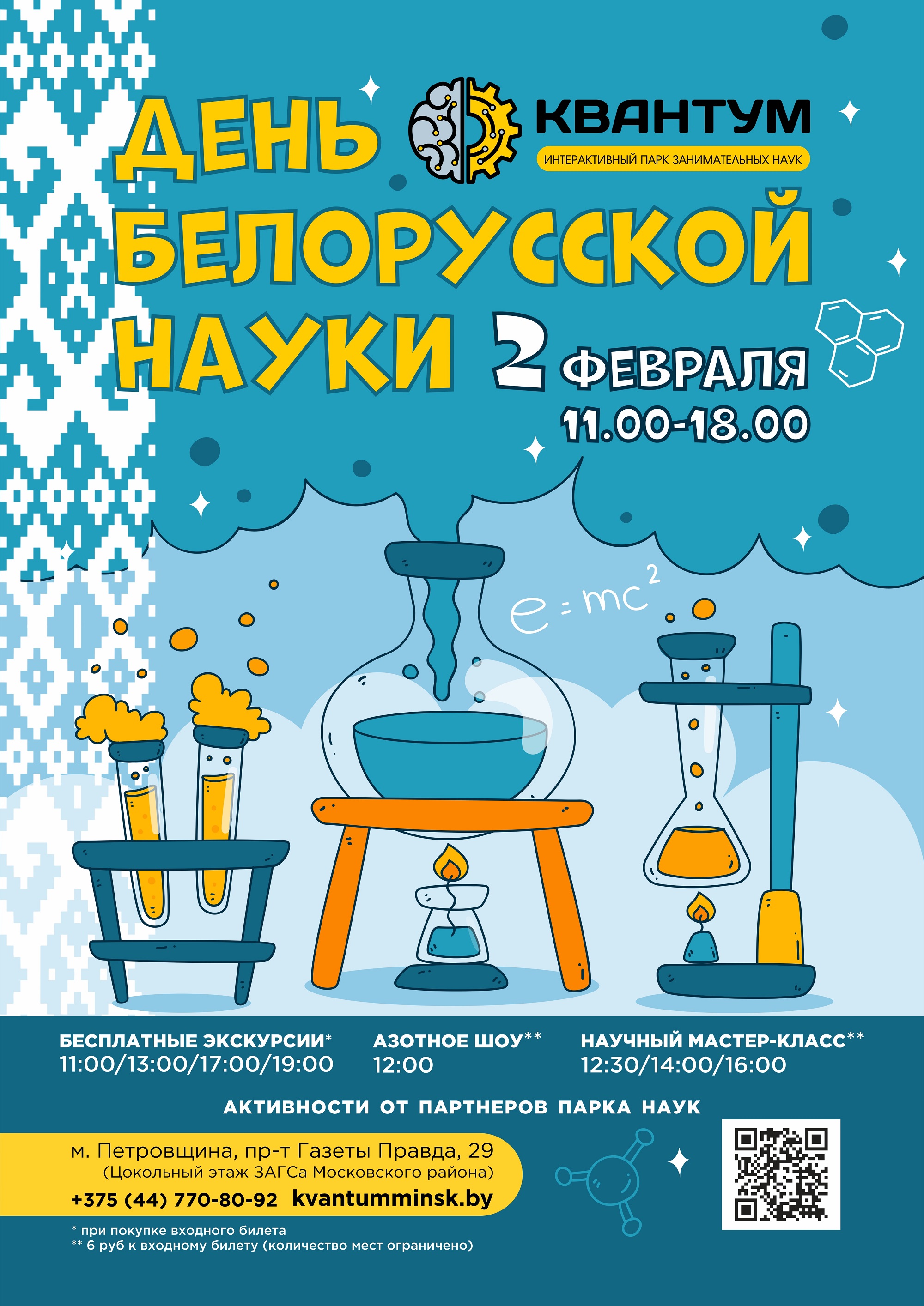 2 февраля - день белорусской науки и в честь этого в парке наук Квантум состоится праздничная программа для любознательных гостей всех возрастов. В программе бесплатные экскурсии, научное азотное шоу, научный мастер-класс.